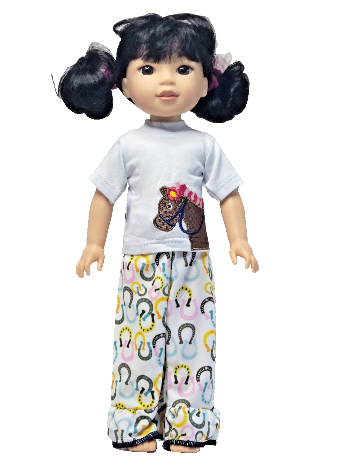 Embroidered horse top and horse shoe print pants.