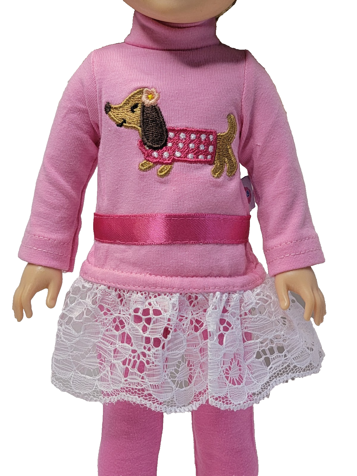 Pink lace trimmed Dachshund top and pink pants.