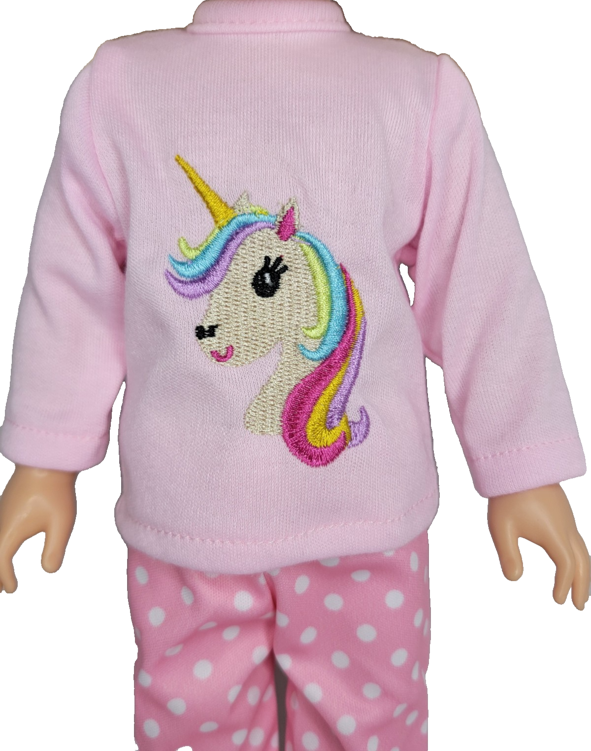 Pink unicorn top and pink polka dot pants.