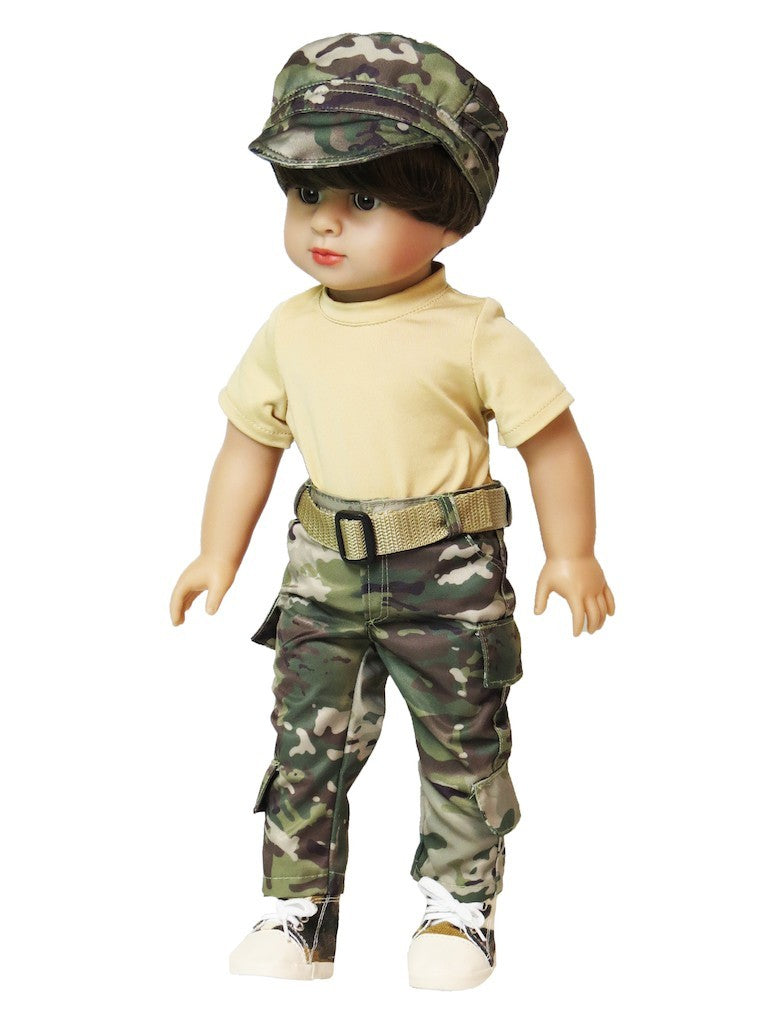Camouflage hat, jacket, pants, short sleeve t-shirt, and shoes.