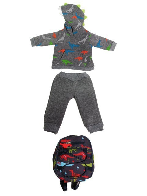 Dinosaur hoodie, pants, and dinosaur backpack.