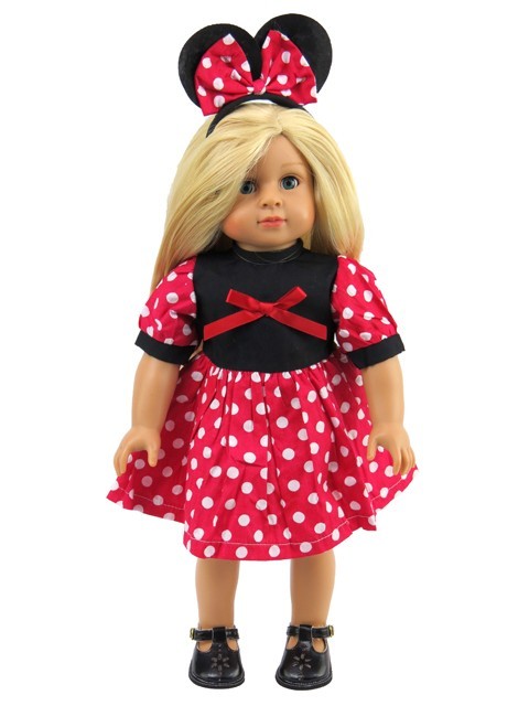 Red polka dot dress and mouse ear headband.