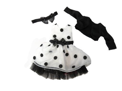 Black and white polka dot dress, black cover, and headband.