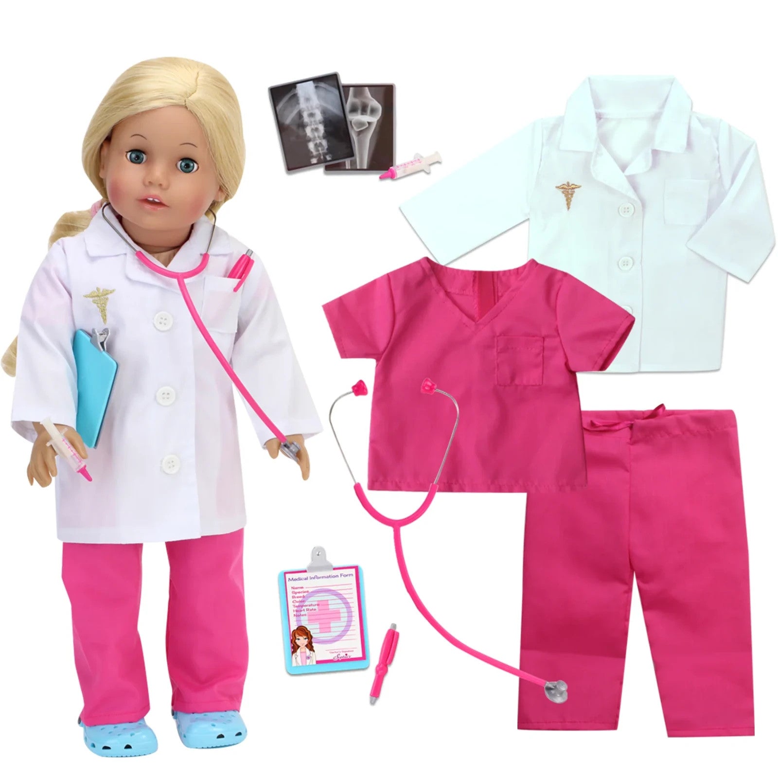 Lab coat, pink scrubs, a stethoscope, a syringe, a pen, a medical form, and a clipboard.