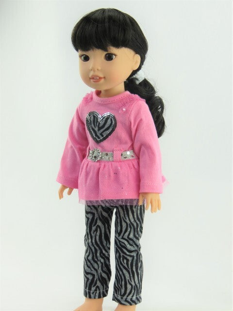 Long sleeve sequin heart shirt and zebra pattern bottoms.